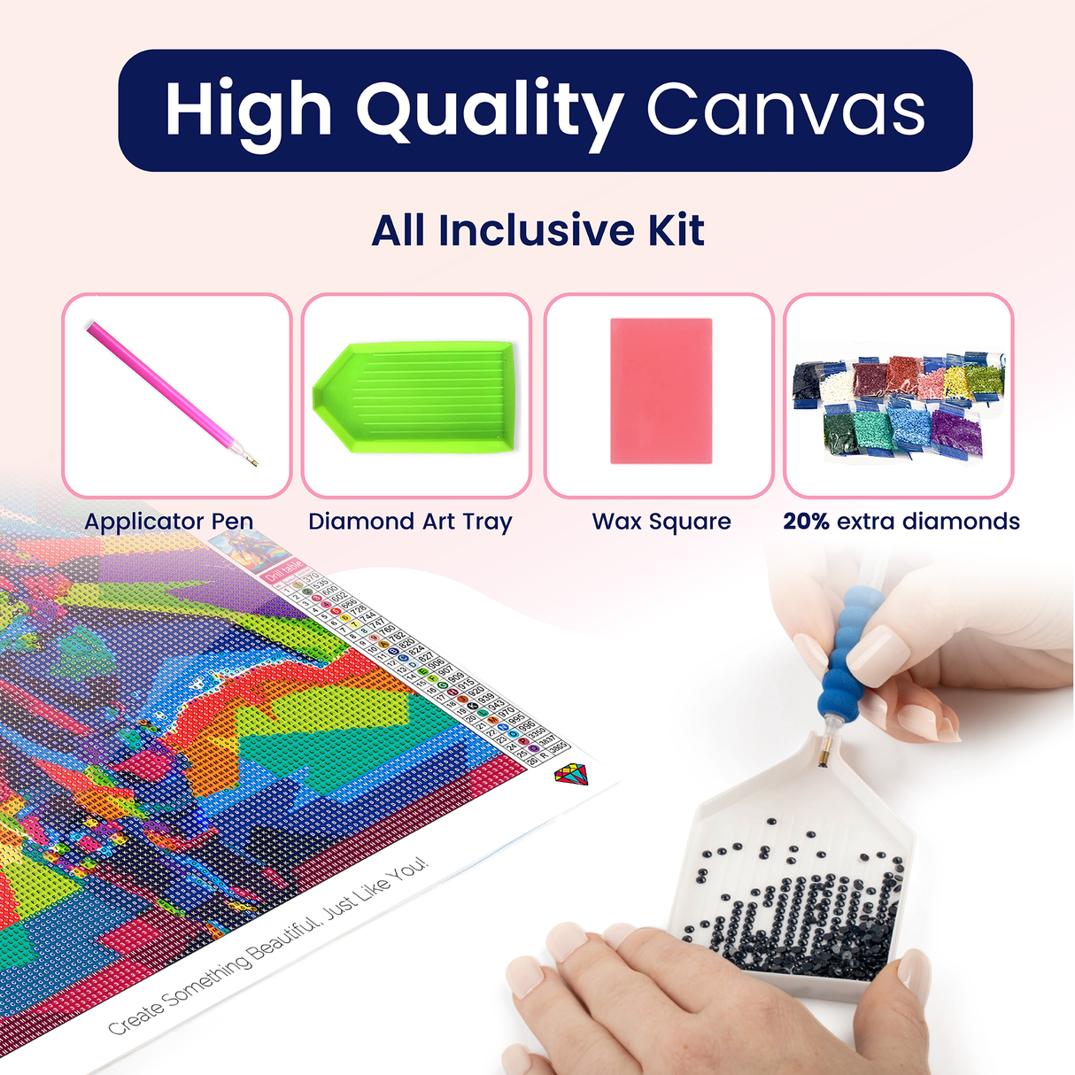 | Designs | Our diamond arts kits offer a clear background and strong adhesive to keep your diamond painting kits for adults in place. and The symbols and letters are legible for ease of use without a light board. |
