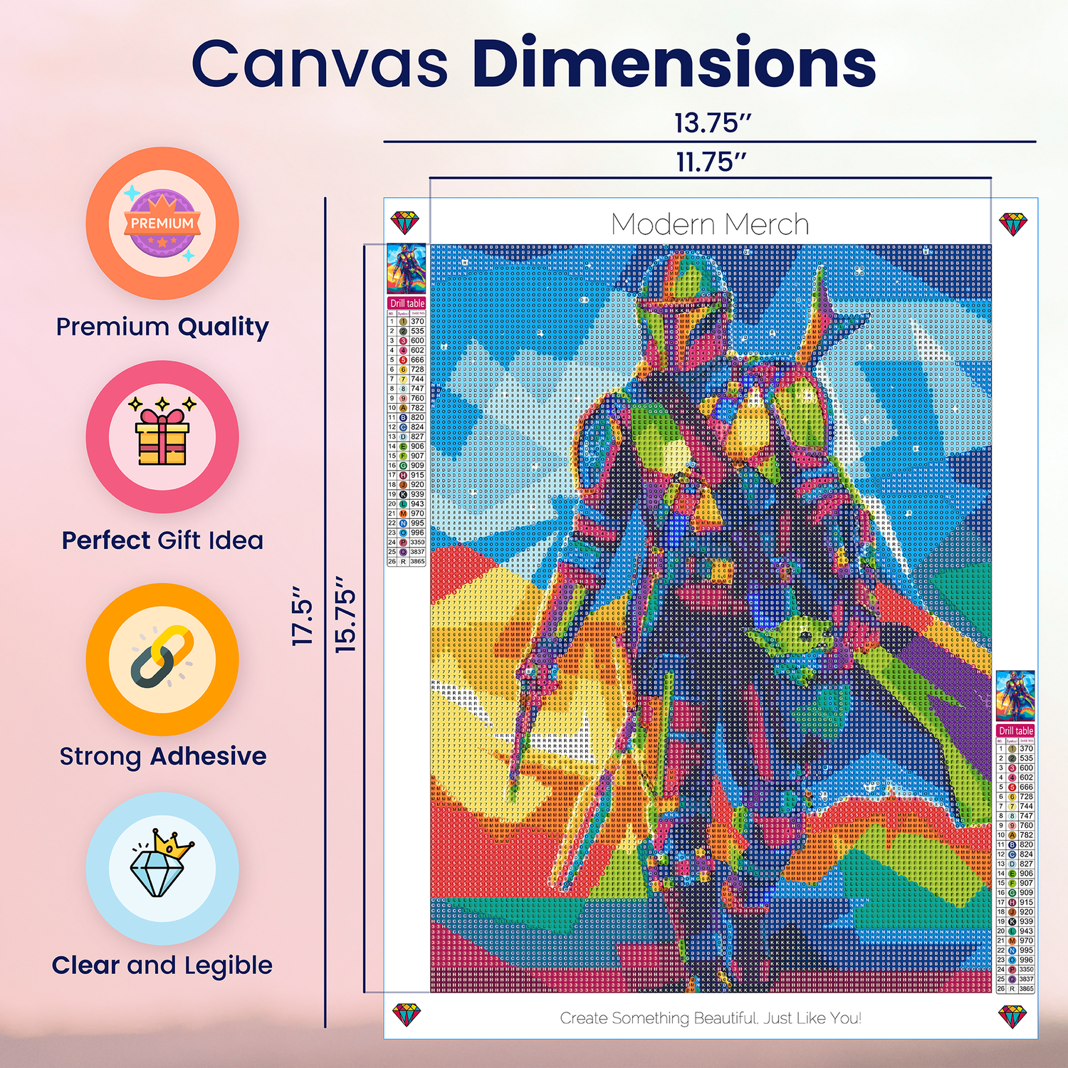 | Colors | All kits come with all the diamonds you need + 30% extra. If you are missing diamonds from your kit, please email us at info@modernmerchus.com |
